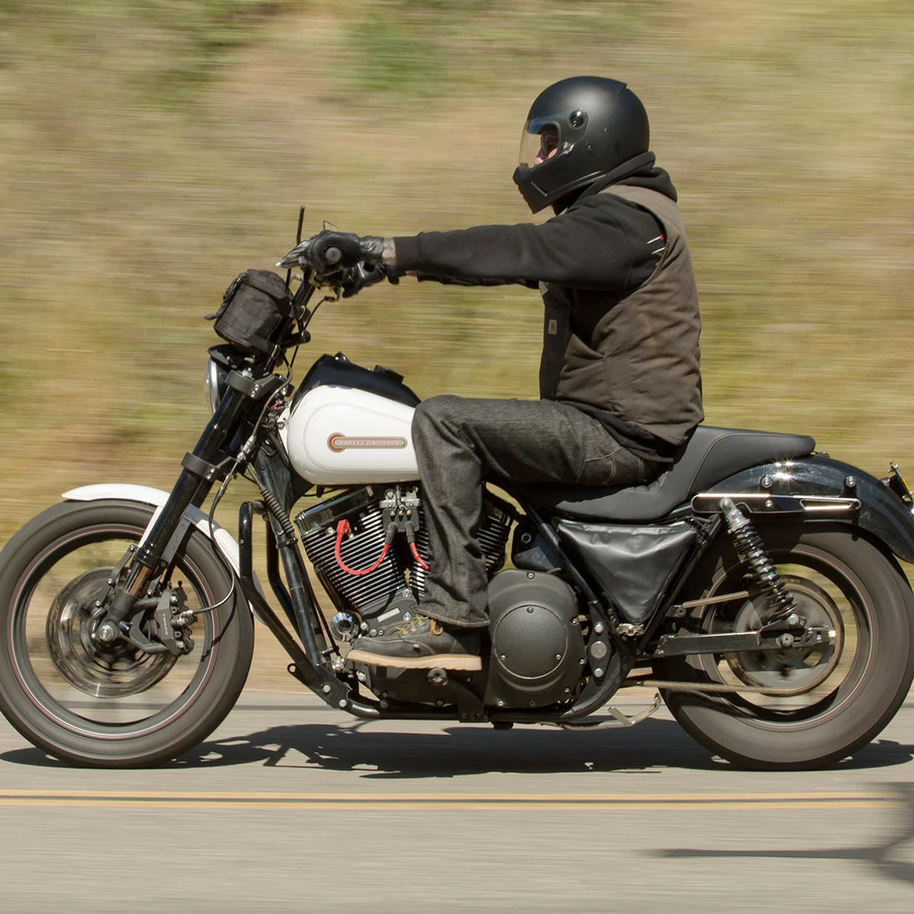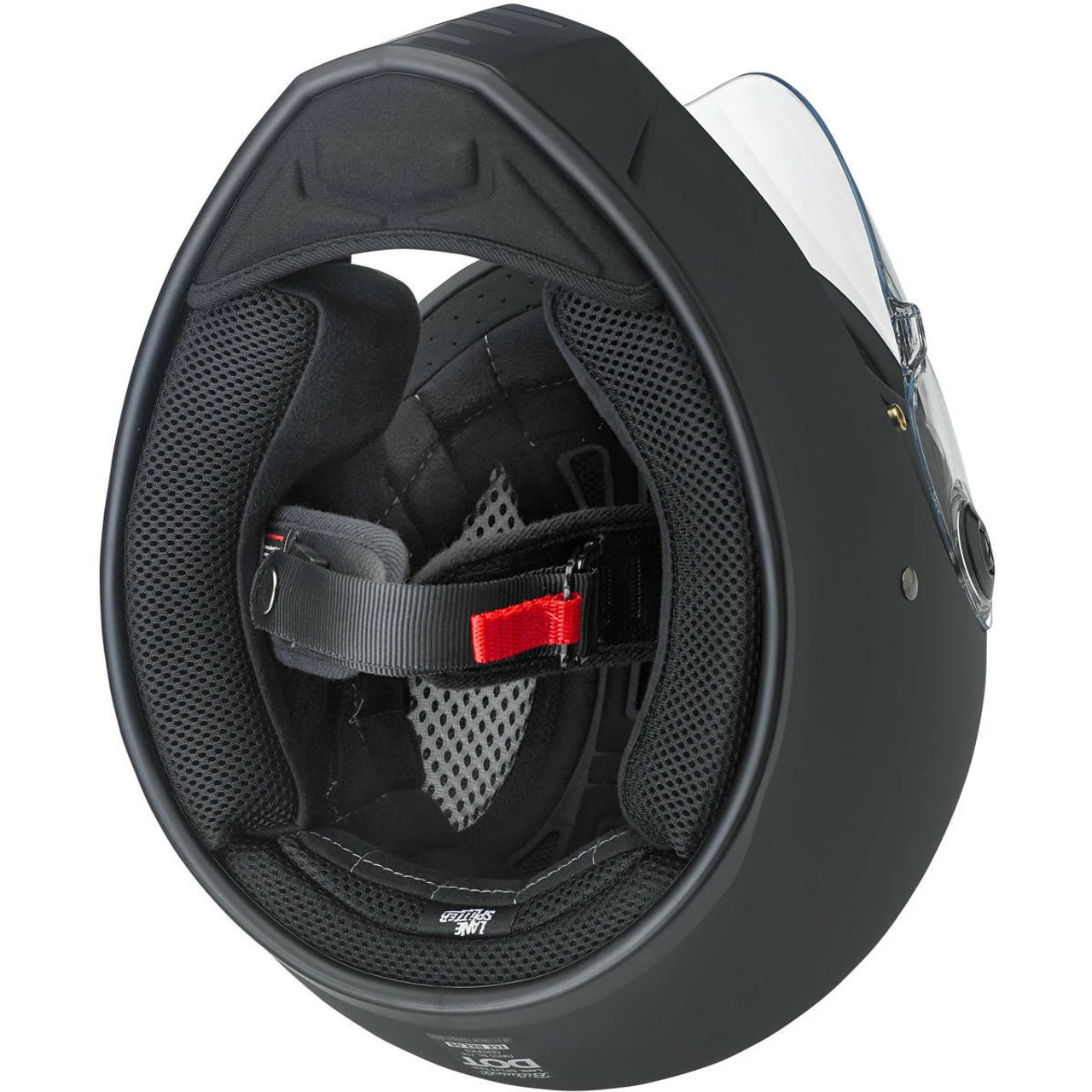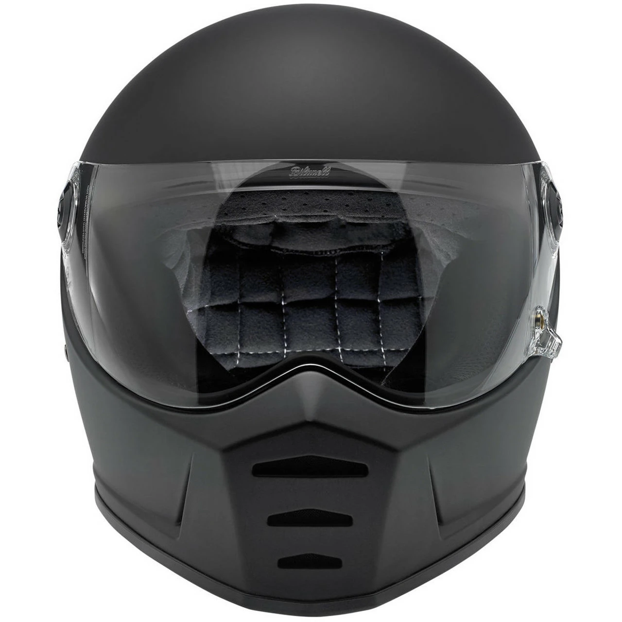 The Lane Splitter is crafted around Biltwell’s proprietary ABS outer shell and features a shock-absorbing EPS liner with hand-stitched interior padding, cheek pads and BioFoam chin bar cushion for comfort. Generous vents in the chin bar get the air flowing and the outlet in back lets hot air escape. The Lane Splitter shield boasts extremely accurate optics and simple hinge mechanics for high style and easy removal for replacement or cleaning. A brass peg and hole configuration on the left side of the shield offers speedy opening and secure closing with little fanfare or complication. Mesh pockets are included in the ear recess–perfect for aftermarket drop in communication systems.