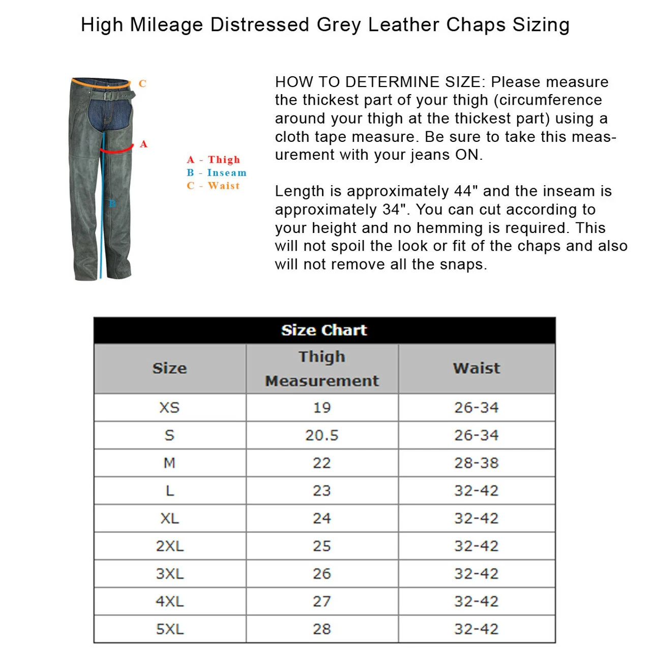 Length is approximately 44″ and the inseam is approximately 34″. You can cut according to your height and no hemming is required. This will not spoil the look or fit of the chaps and also will not remove all the snaps.