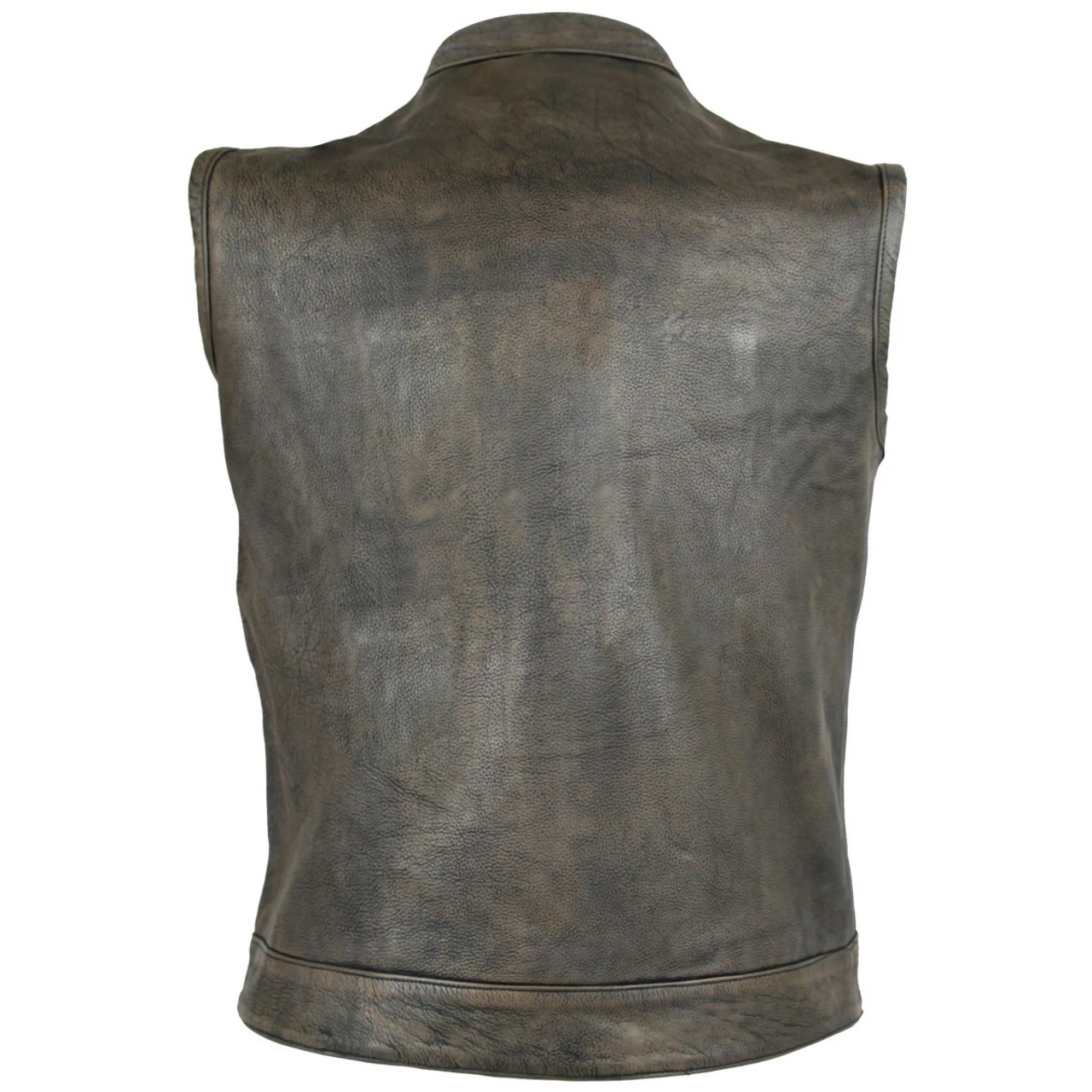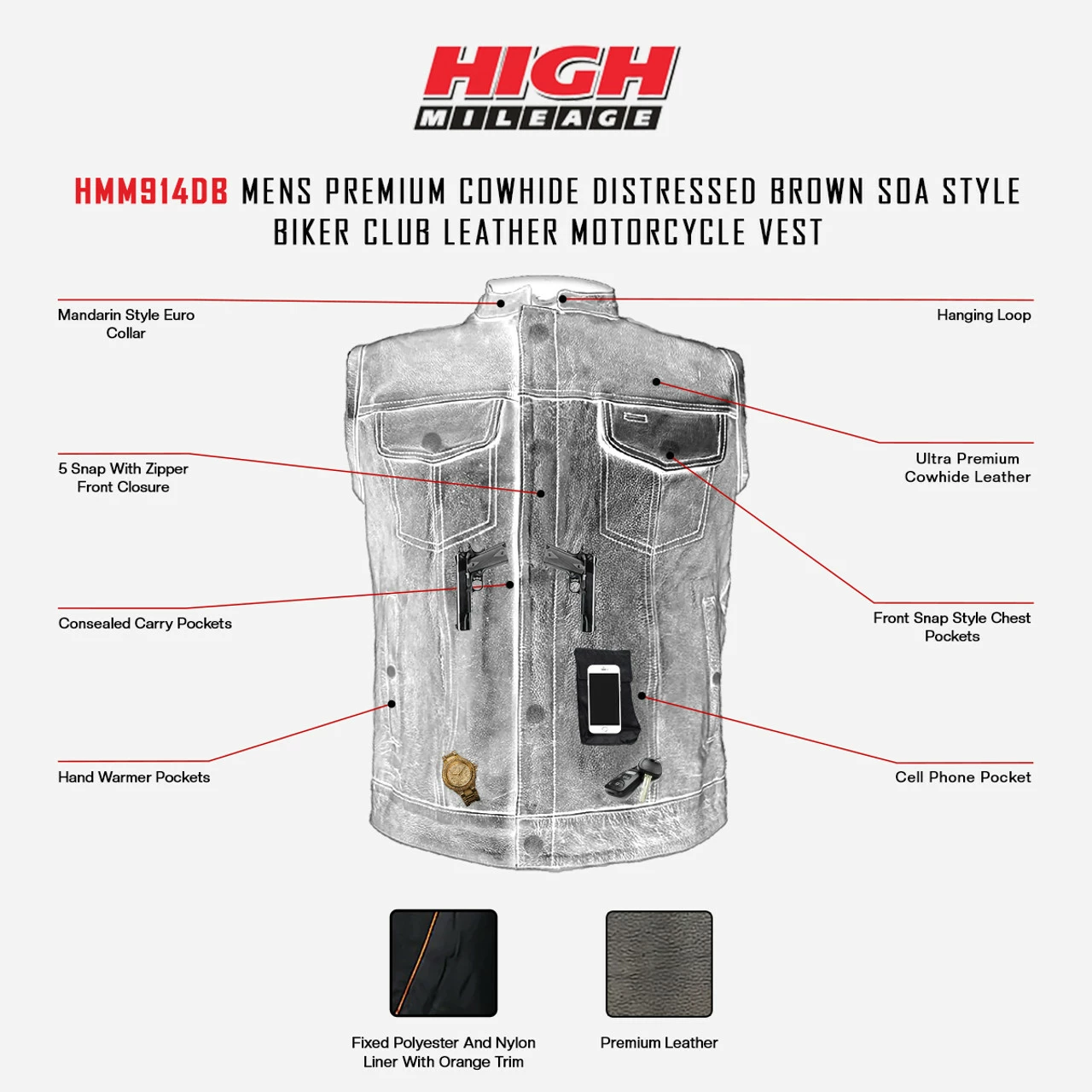 High Mileage HMM914DB Mens Premium Cowhide Distressed Brown SOA Style Biker Club Leather Motorcycle Vest.