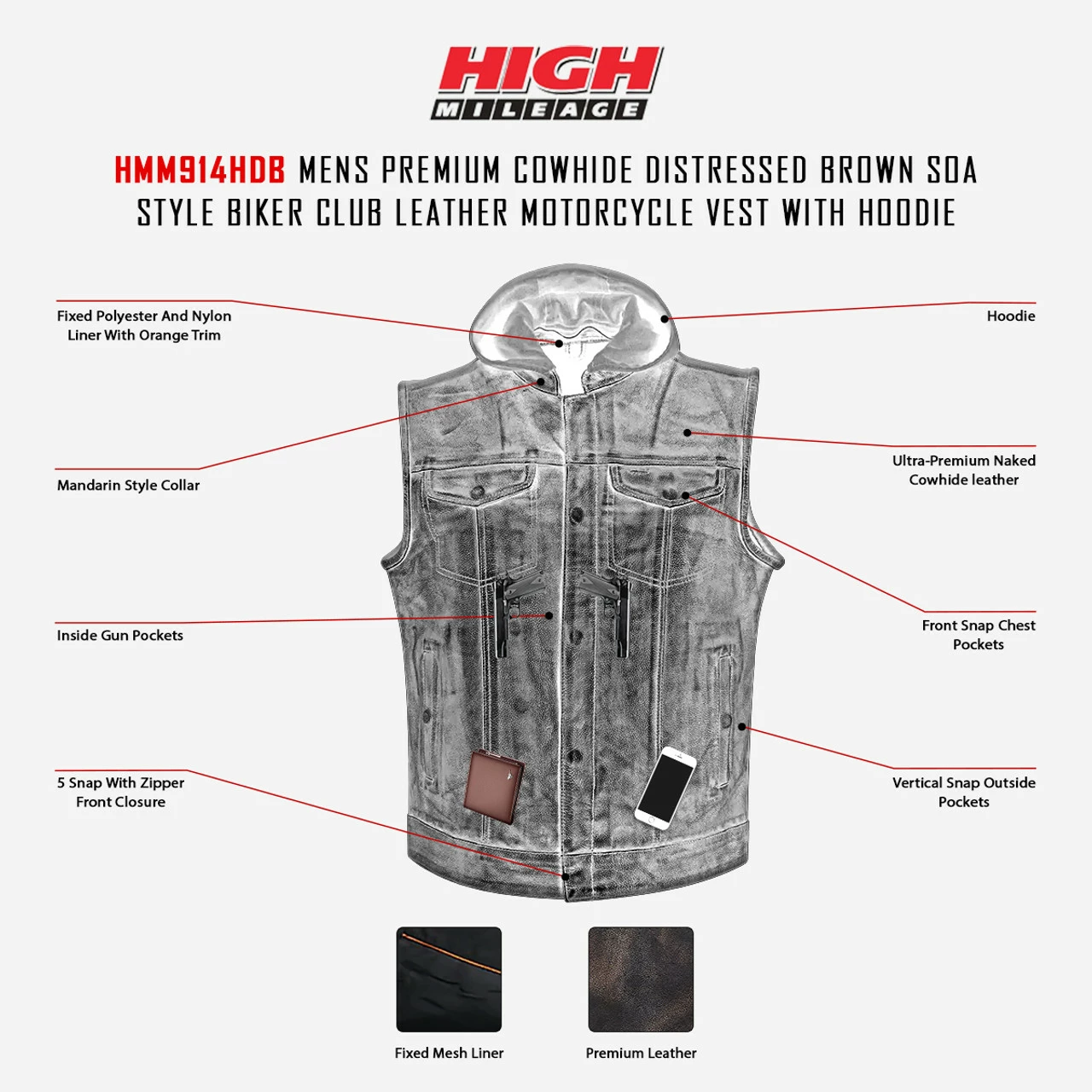 High Mileage HMM914HDB Mens Premium Cowhide Distressed Brown SOA Style Biker Club Leather Motorcycle Vest With Hoodie.