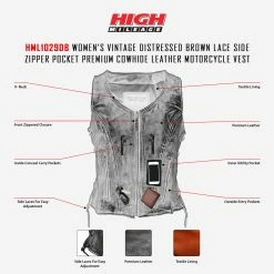 High Mileage HML1031DB Women’s Vintage Distressed Brown Premium Cowhide Leather Motorcycle Vest