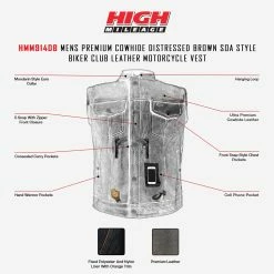 High Mileage HMM915DB Mens Distressed Brown Premium Cowhide Ten Pocket Leather Motorcycle Vest