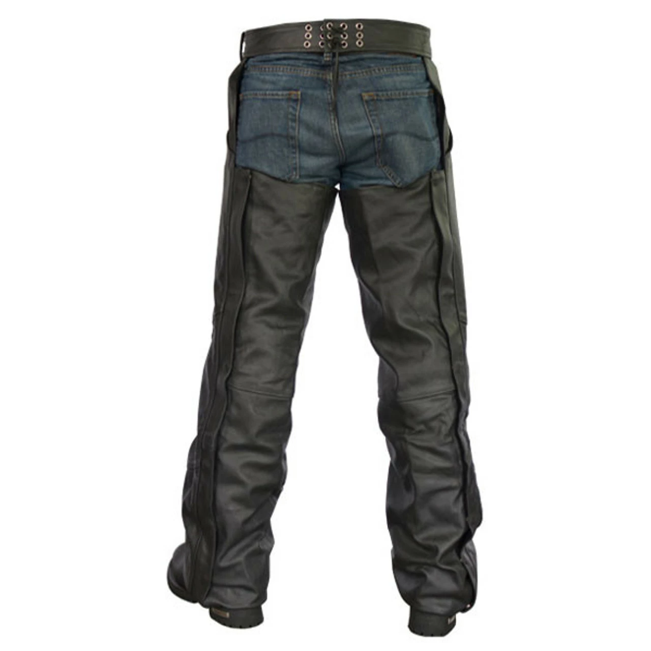 Tall Chaps, Mens Plain Biker Leather Chaps are made for our riders blessed with longer legs. They are crafted from premium leather and boast a stretch panel in the groin area for more comfort and for a better fit. These chaps are available in a wide range of sizes for the tall rider, from S to 5XL. The leg length for the S to 2XL is 45 inches; for 3XL, it is 46 inches; and for 4XL to 5XL, it is 47 inches. These chaps have an unfinished bottom so that you can cut them to your size. These tall chaps have a fixed nylon mesh line, and they also come with a removable quilted thermal liner for those days or mornings when there is a chill in the air.