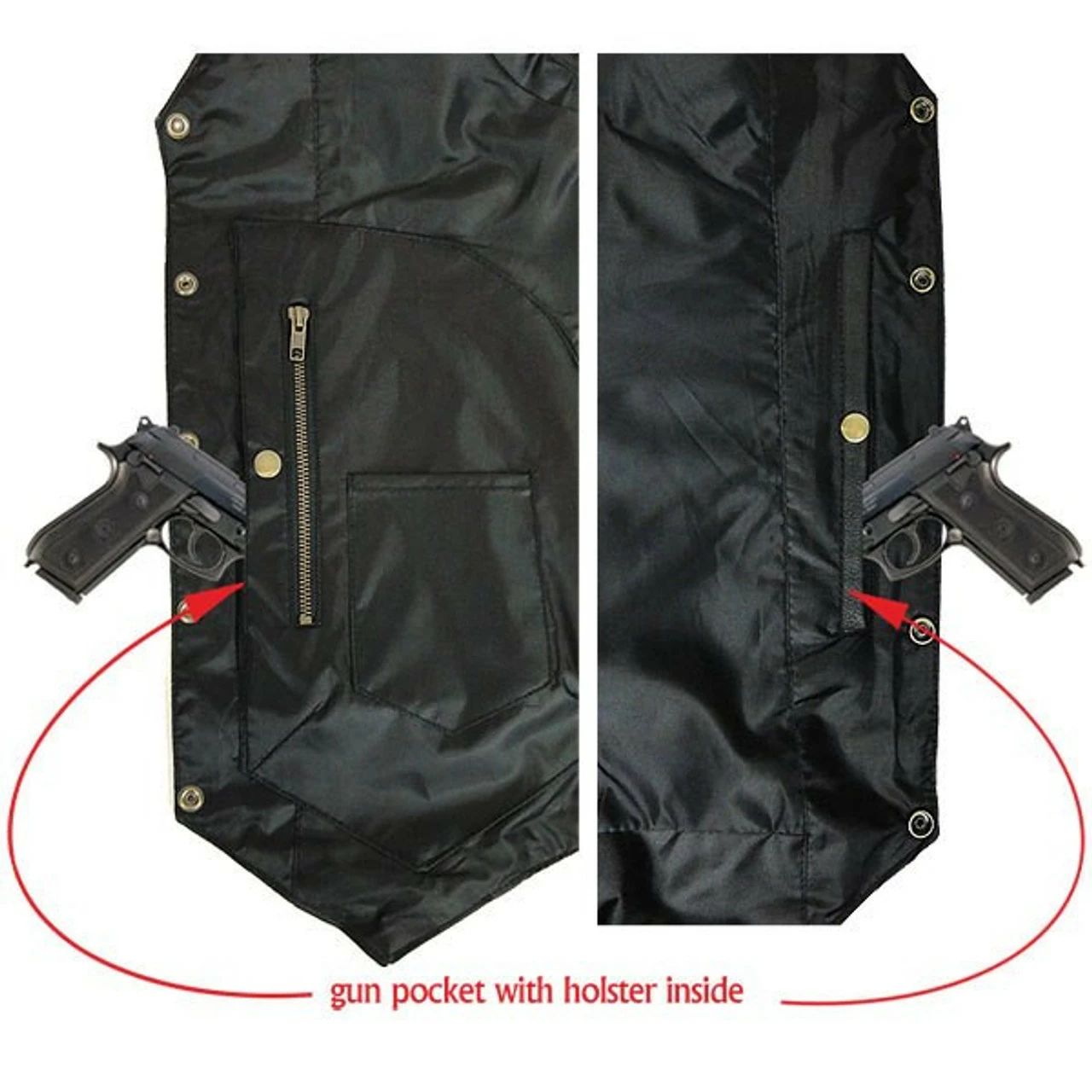 - 2 Internal buttoned conceal carry pockets, with additional zippered and open pocket on right side of chest with holsters