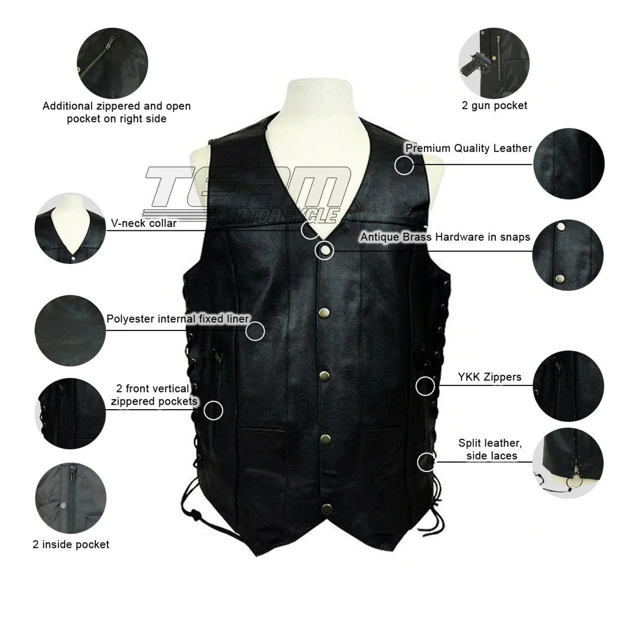 - YKK Zippers with leather pull tabs for ease of use with riding gloves