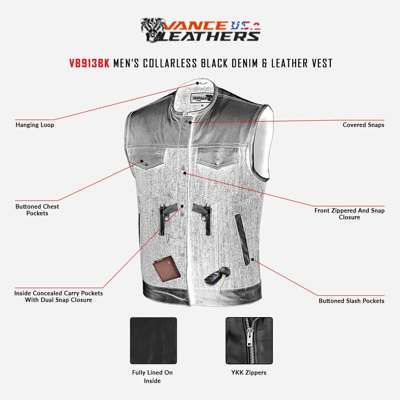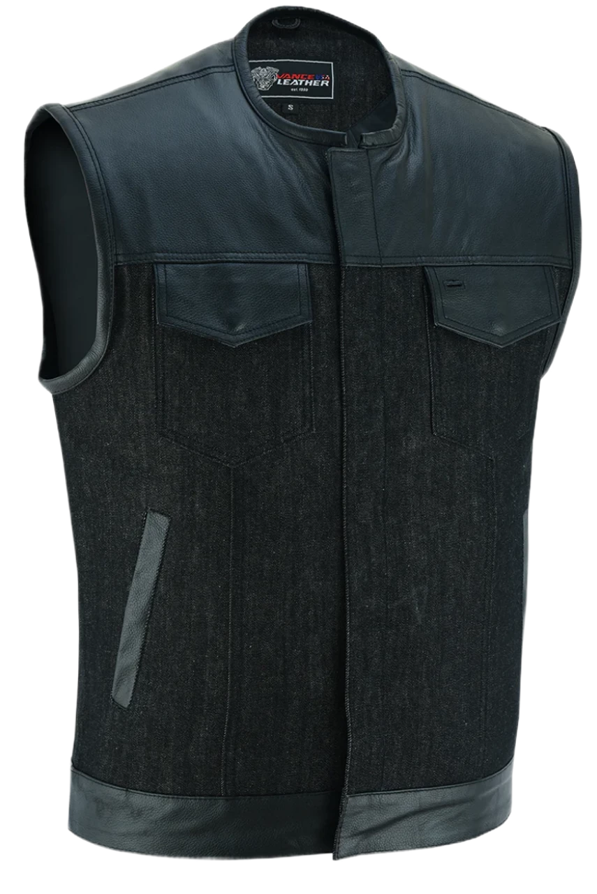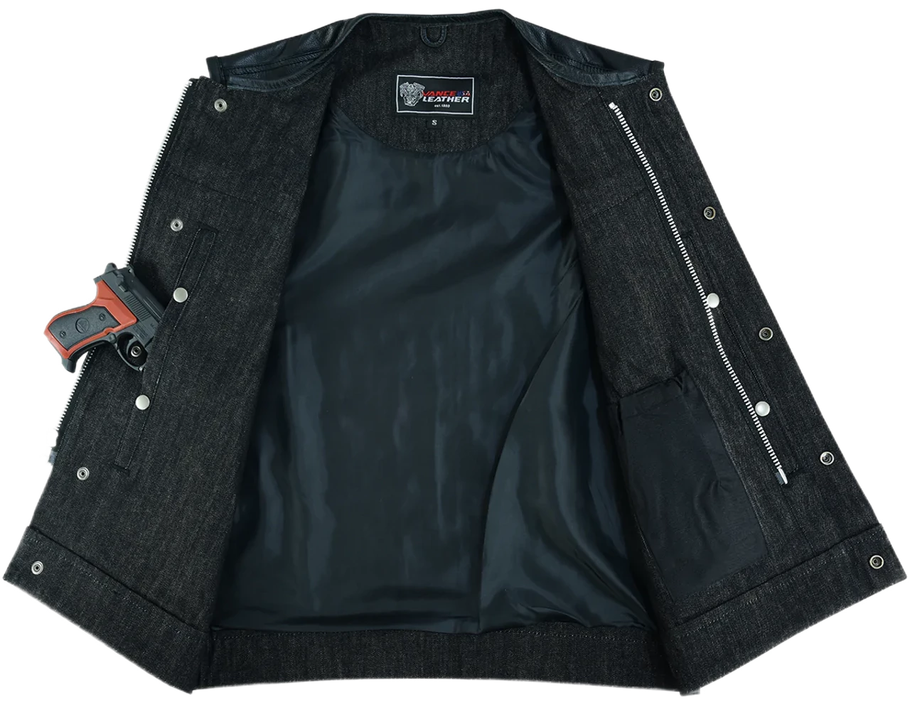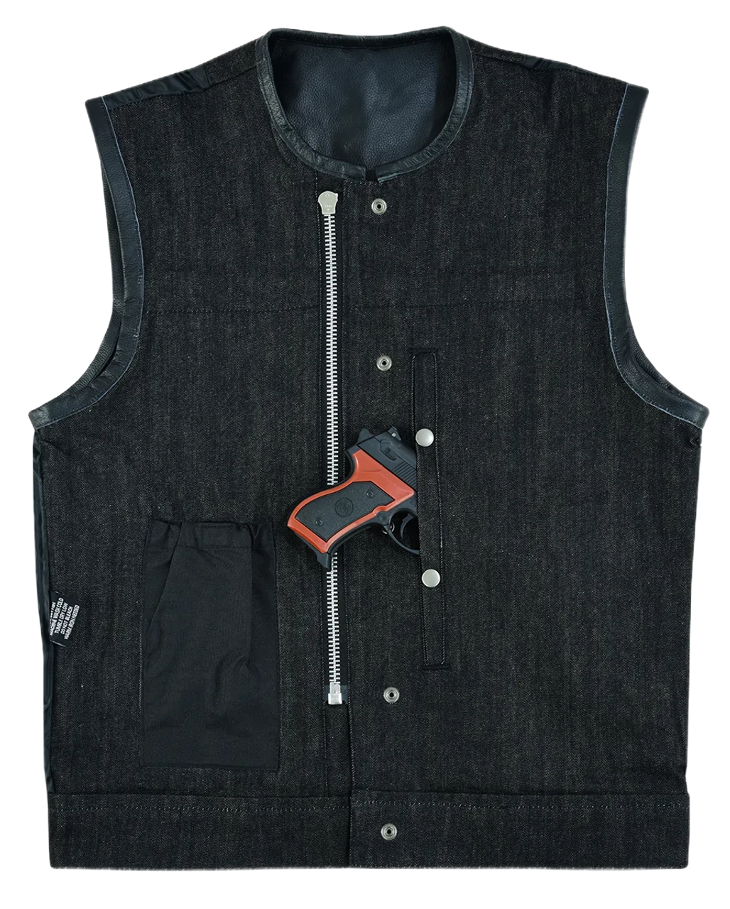- Club style vest with one-inch preacher collar, covered snaps, and hidden zipper