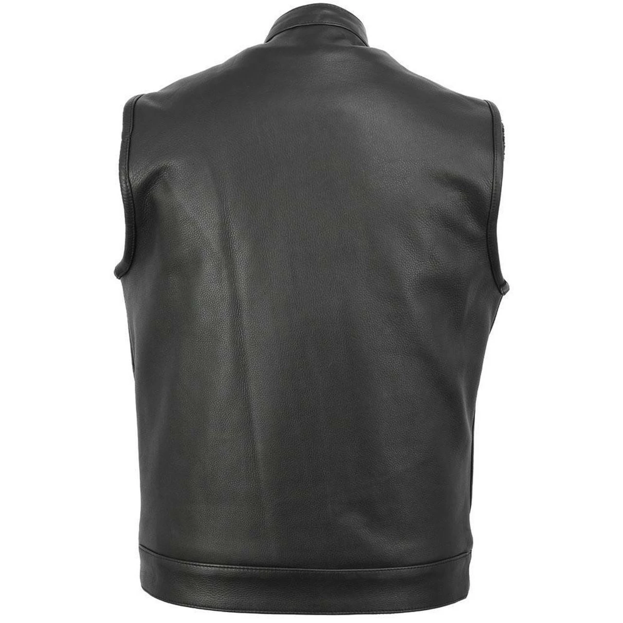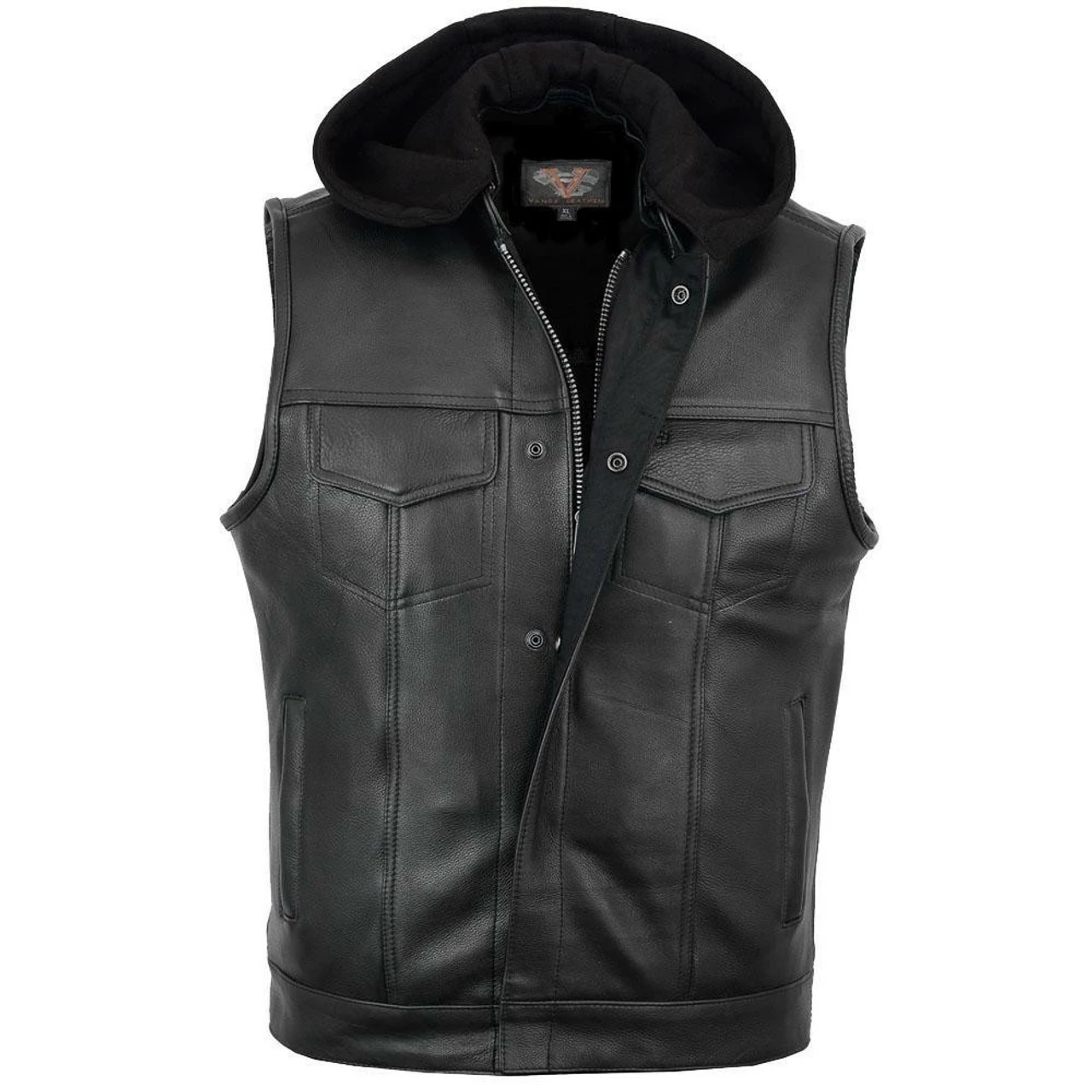 Vance VL914H Mens Black Premium Cowhide Leather Motorcycle Biker SOA Style Club Vest with Hoodie.