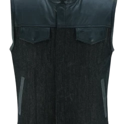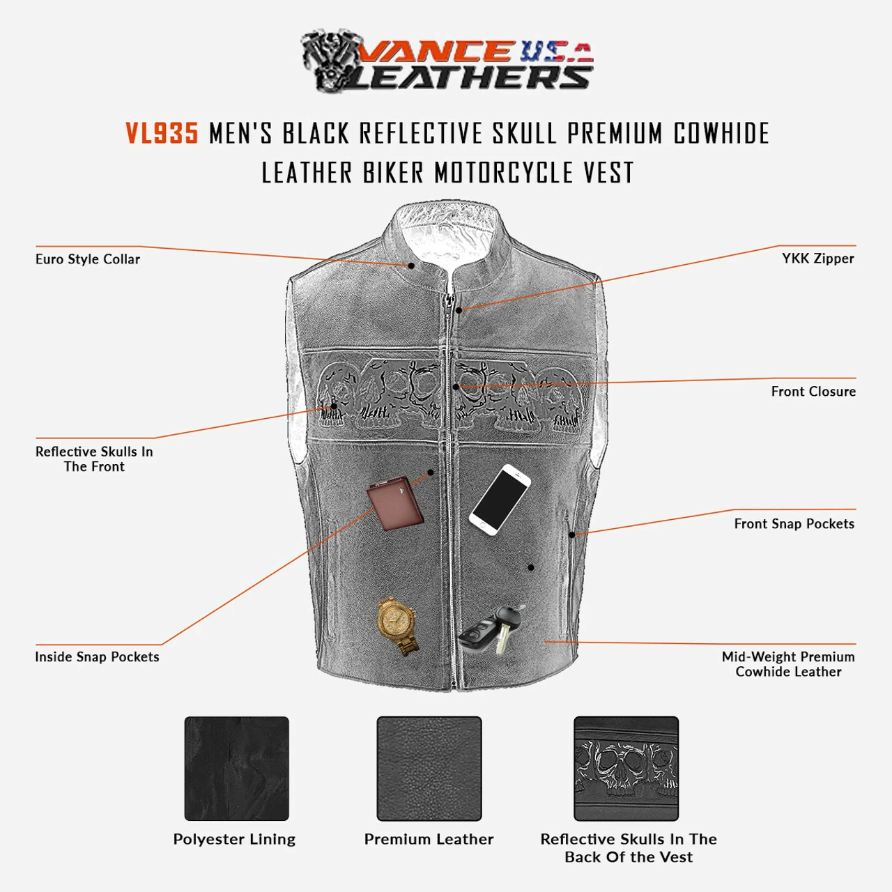 Vance VL935 Men’s Black Reflective Skull Premium Cowhide Leather Biker Motorcycle Vest.