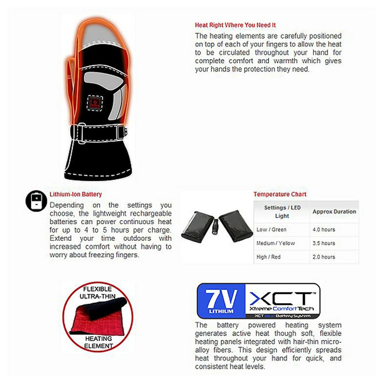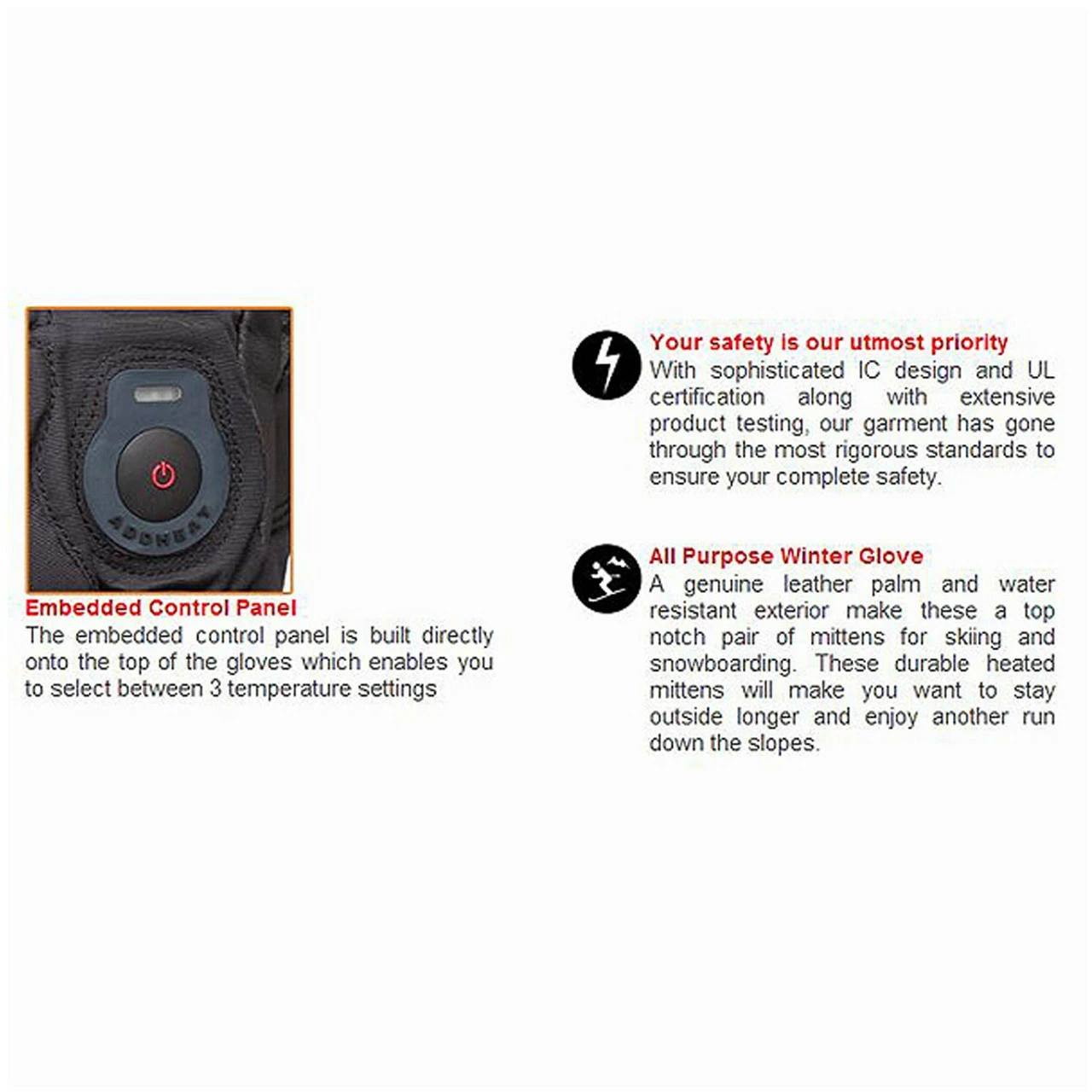 Heated Mittens will keep your hands warm and comfortable while out in the cold. The on-board control-panel lets you adjust the settings with the gloved hand minimize the exposure to the bitter, chilling winter air.