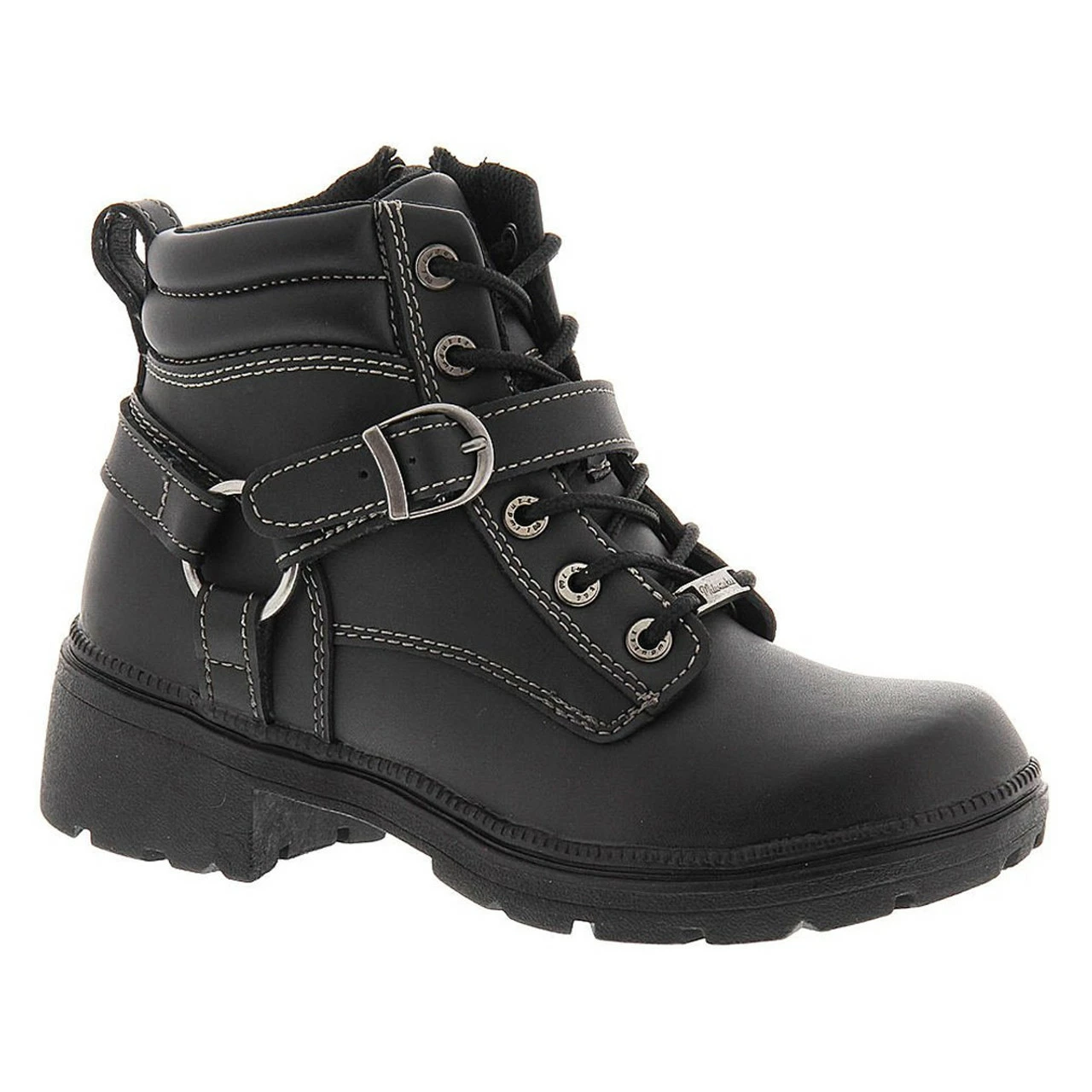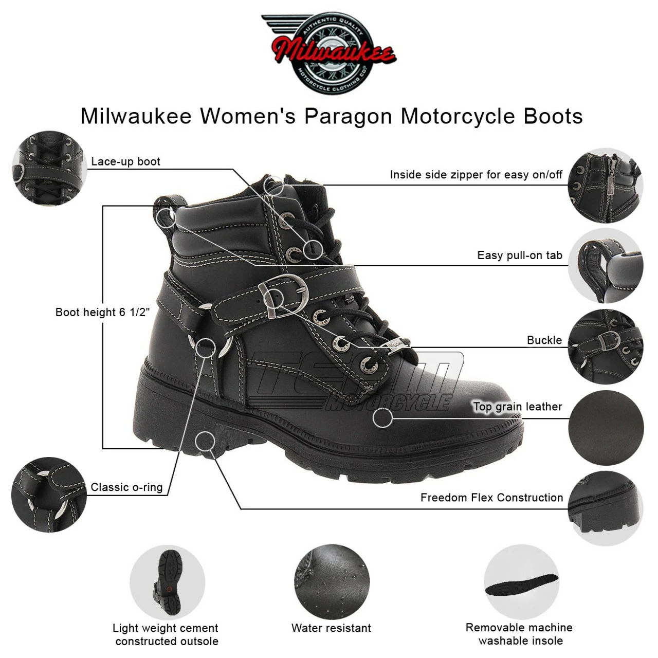 The ladies Paragon by Milwaukee Motorcycle Clothing Company is a light weight leather riding boot. Lace-up boot with classic o-ring and buckle. Also features an easy pull-on tab on back and inside side zipper. Inside each pair, we offer Freedom Flex Construction. The mid-sole of these unique boots is crafted to conform to the natural bend of the arch of your foot allowing you to bend and move more freely. Light weight cement construction outsole with removeable washable insoles.
