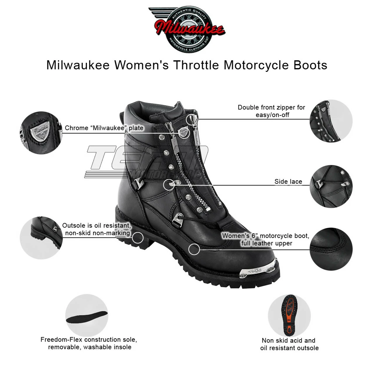 - Women’s 6″ motorcycle boot, full leather upper, double front zipper for easy/on easy/off